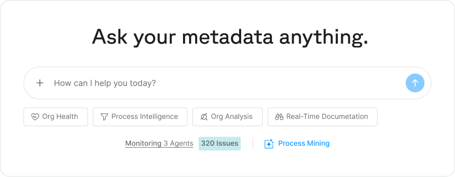 Gain full visibility into your org’s metadata with AI-powered Documentation, real-time change tracking, and impact analysis to ensure stability, security, and optimized performance.